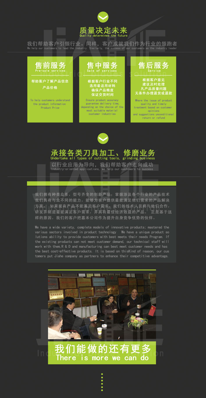 憑借優良的設備,精湛的工藝,嚴格的檢驗,完善的售后服務,力求產品質量精益求精。致力于打造精密刀具一流品牌!